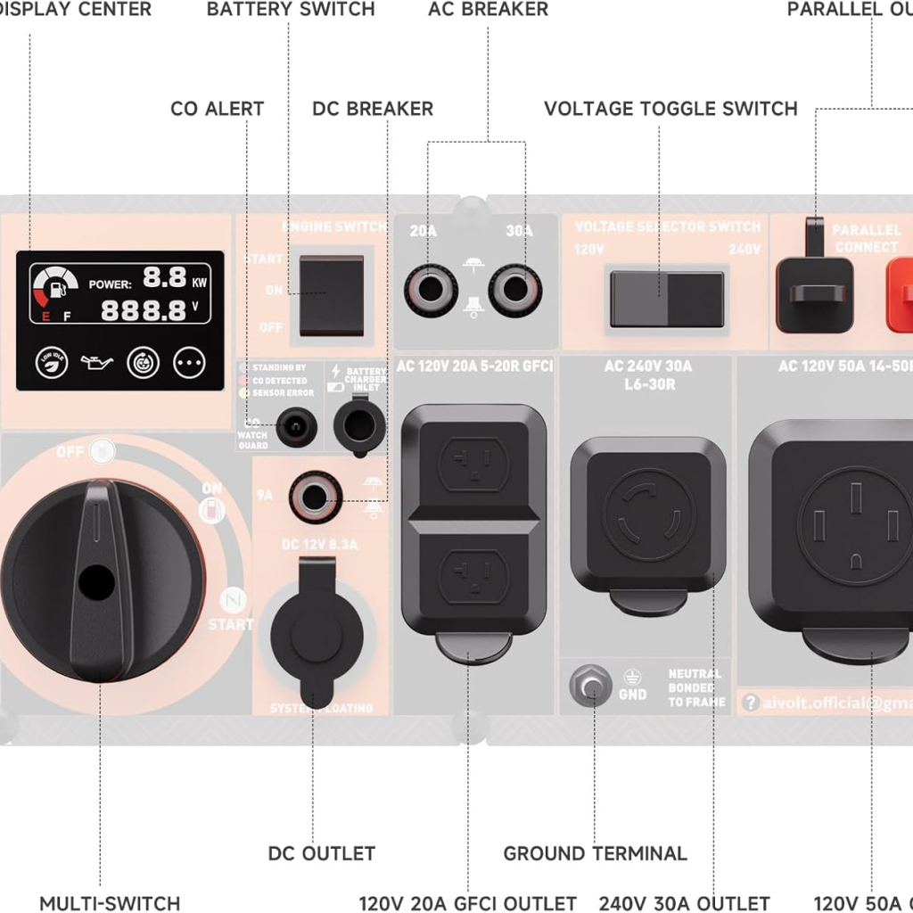• ⛜Dual Fuel Freedom and Safe Power for Electronics – Equipped with AIVOLT’s automatic fuel-switching technology, this dual fuel inverter generator switch seamlessly between gas and propane ‌without manual adjustments‌. ‌≀3% THD pure sine wave output ensures safe, stable power for sensitive electronics like phones, laptops, gaming consoles, and medical devices, protecting them from power surges